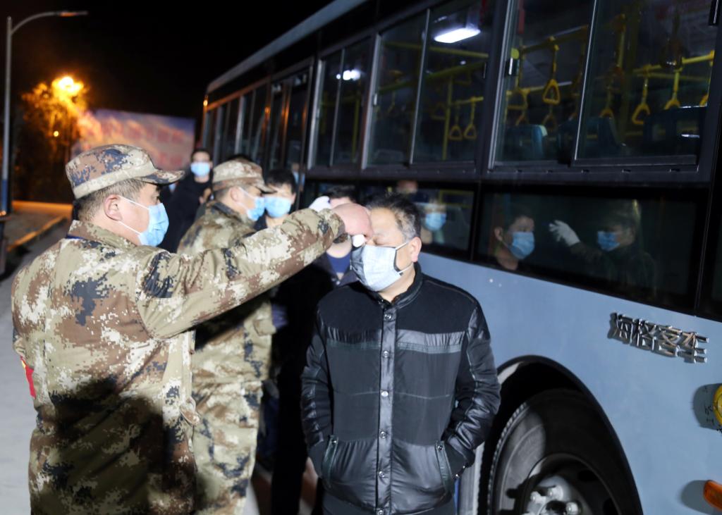 上圖為2月3日深夜22:48,曹輝為即將乘車的職工檢測體溫