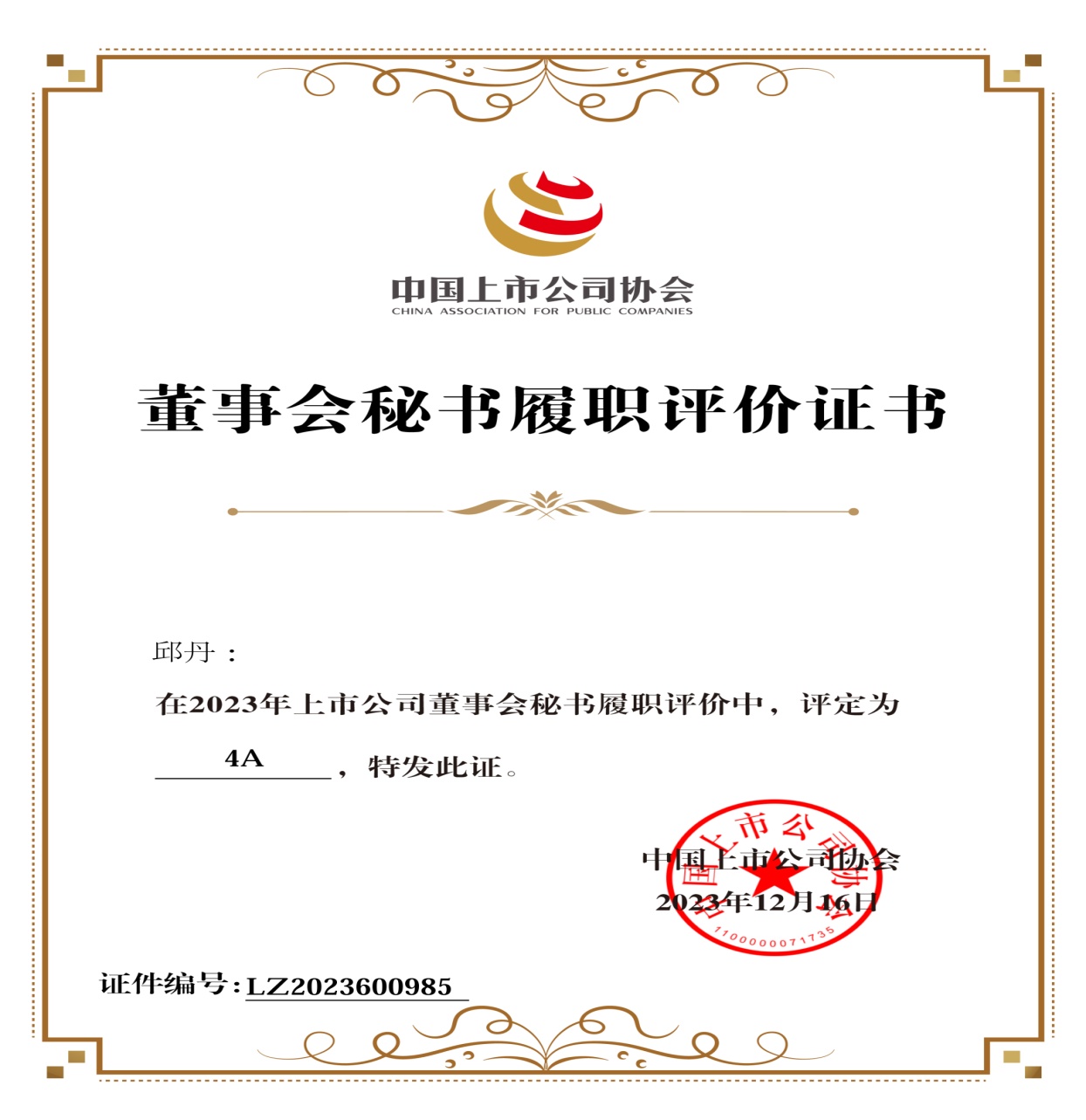 繼淮北礦業(yè)榮獲中國(guó)上市公司協(xié)會(huì)“2023年上市公司董事會(huì)優(yōu)秀實(shí)踐案例”后,近日中國(guó)上市公司協(xié)會(huì)“2023上市公司董事會(huì)秘書履職評(píng)價(jià)”“2023上市公司董辦最佳實(shí)踐創(chuàng)建活動(dòng)”結(jié)果先后發(fā)布,淮北礦業(yè)集團(tuán)黨委常委,淮北礦業(yè)副總經(jīng)理、董事會(huì)秘書邱丹連續(xù)兩年榮獲董事會(huì)秘書履職4A評(píng)級(jí),證券投資部首次榮獲董辦優(yōu)秀實(shí)踐案例。